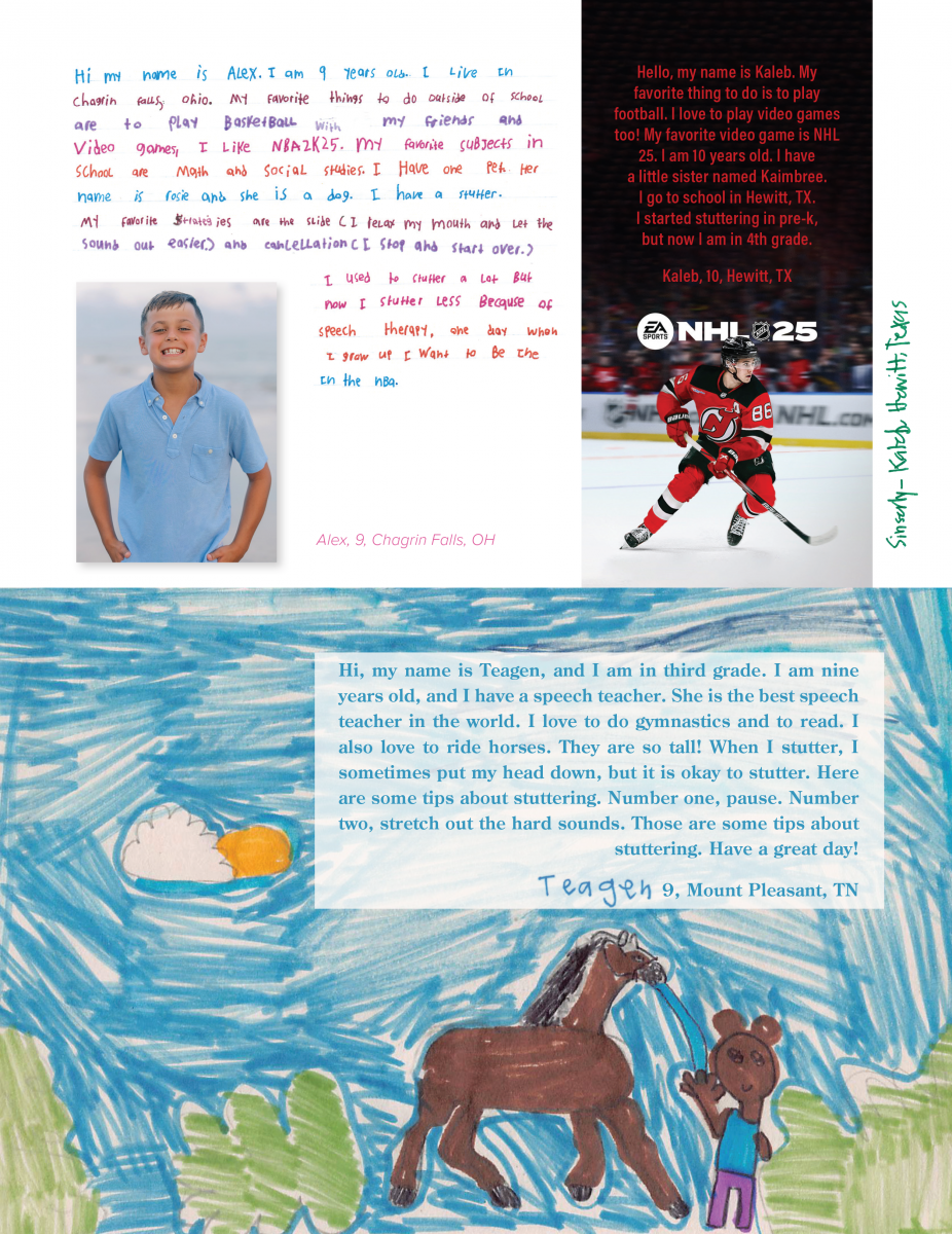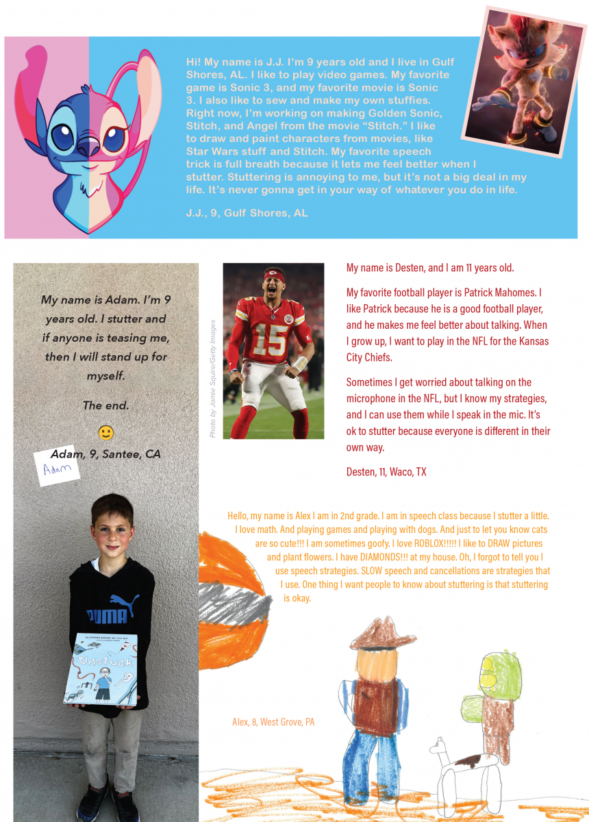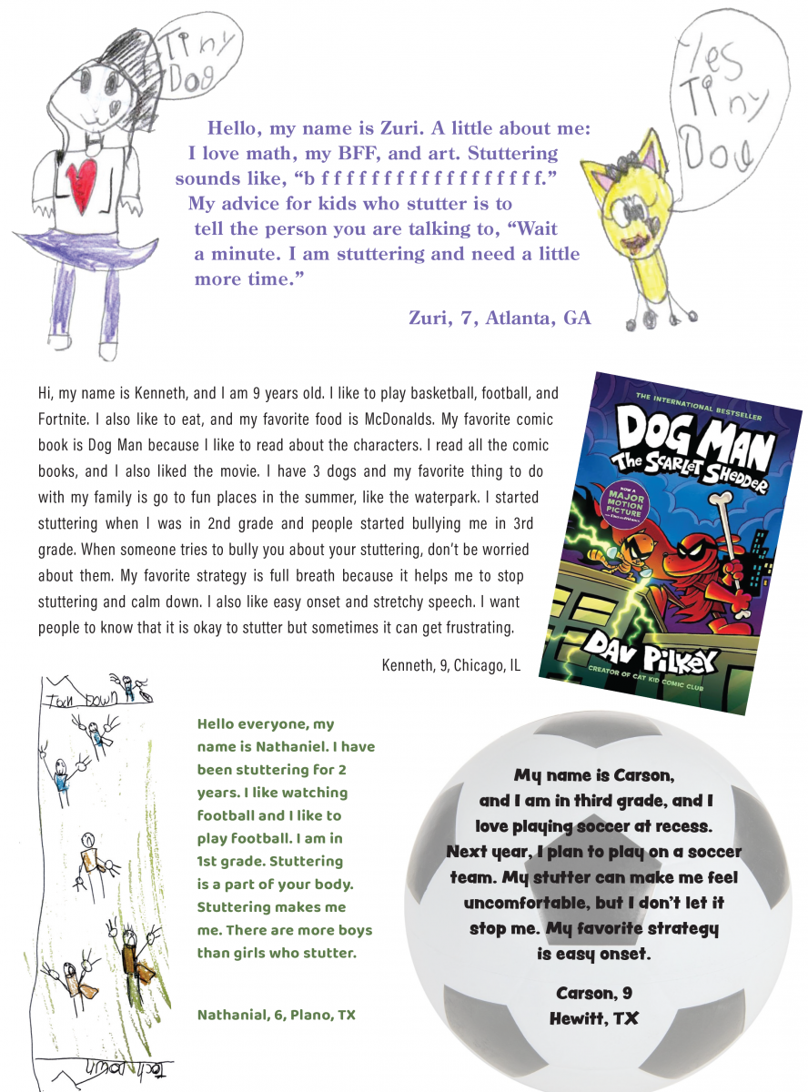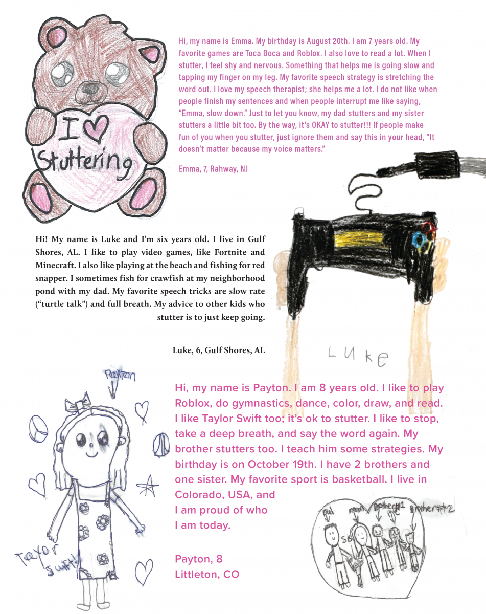 We love to get your letters and artwork to share, but we must have written permission from a parent to use them. Send your letters or pictures with signed permission to SFA, P.O. Box 11749, Memphis, TN 38111-0749 or email info@stutteringhelp.org