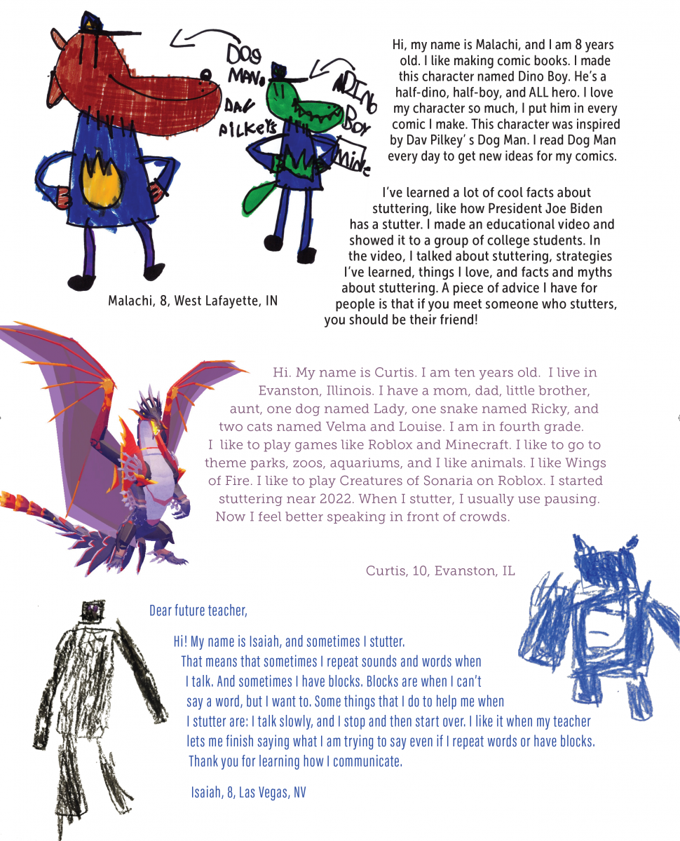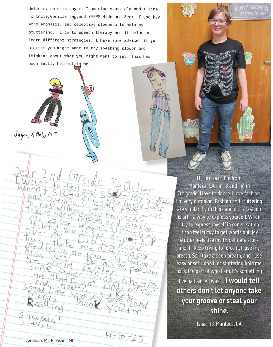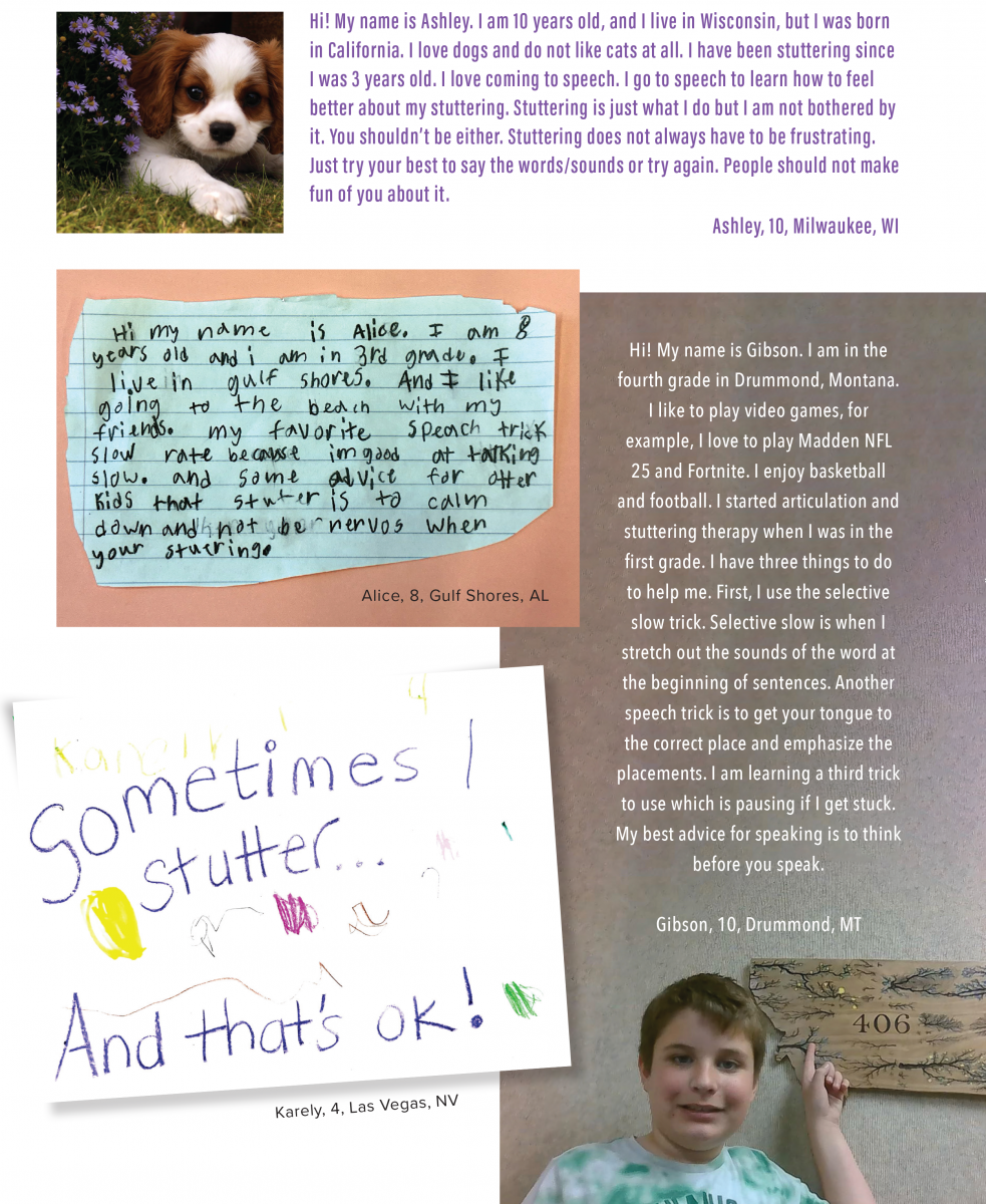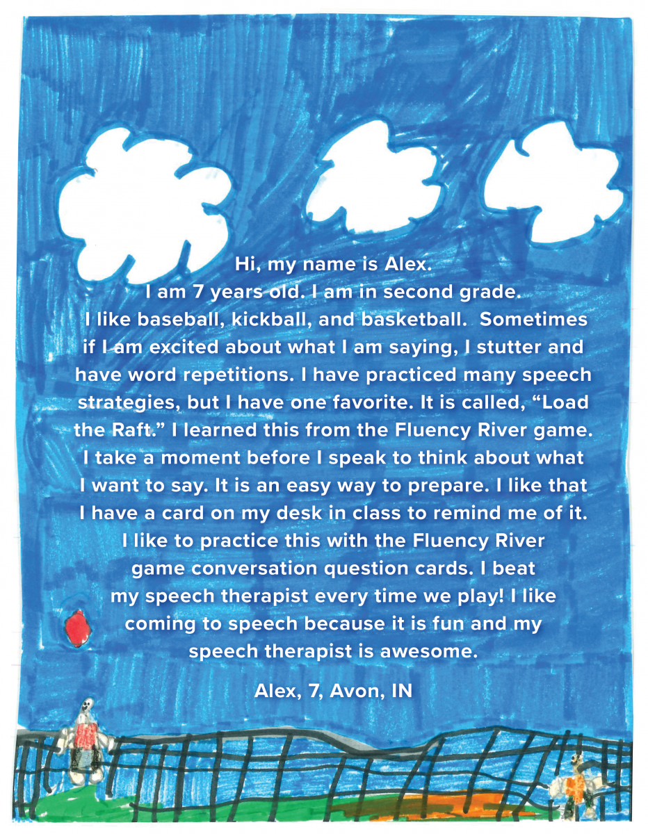 We love to get your letters and artwork to share, but we must have written permission from a parent to use them. Send your letters or pictures with signed permission to SFA, P.O. Box 11749, Memphis, TN 38111-0749 or email info@stutteringhelp.org
