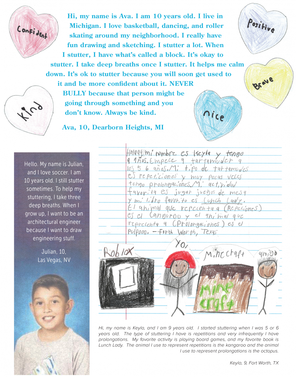 My name is Gabriel and I am 10 years old. I do speech therapy at Olive Crest Academy in Orange, California. I am a very cool kid and I like coming to school, sometimes. My favorite things are playing with my friend Manny, riding my bike, and playing soccer. I keep saying that I do not ever ever ever stutter but my speech therapist tells me that I do. When my words get stuck and won’t come out the way I want, I feel very mad. I feel like an idiot. I feel angry and dumb. We have been reading stories about your foundation and about kids who stutter. I am not sure if I like listening to the stories or not. My therapist suggested I write you a letter but I was not sure if I really wanted to. The strategies I remember are waiting 2 seconds, pausing for 1 second in the middle of my sentence, and cancellation, where I stop, pause, reverse and start over. This is all I really have to say. Are you going to write back to me? I sure hope so, because I want to know how you feel about my letter.Gabriel R., 10, Orange, CA