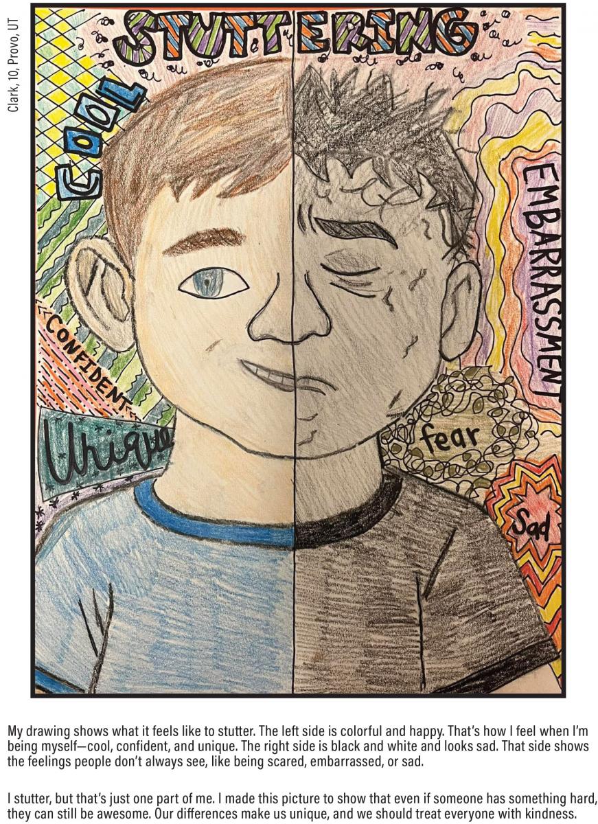 Christopher of Marlboro, N.J., drew this picture. It says, “I don’t care what people say or if they laugh when I stutter. I am happy being myself. Stuttering is a good experience for me because life is sometimes hard.”