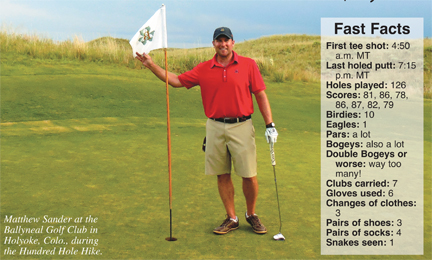 The Hundred Hole Hike is a worldwide network of golf marathons where participants plan to walk and play 100 or more holes of golf in one day in order to raise money for various charitable causes. This year 93 hikers participated in the golf marathon, a record high for participation. So far the 2014 Hundred Hole Hike has raised more than $250,000 in donations for various causes, and pledges are still being accepted.
