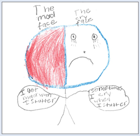 Christopher of Marlboro, N.J., drew this picture. It says, “I don’t care what people say or if they laugh when I stutter. I am happy being myself. Stuttering is a good experience for me because life is sometimes hard.”