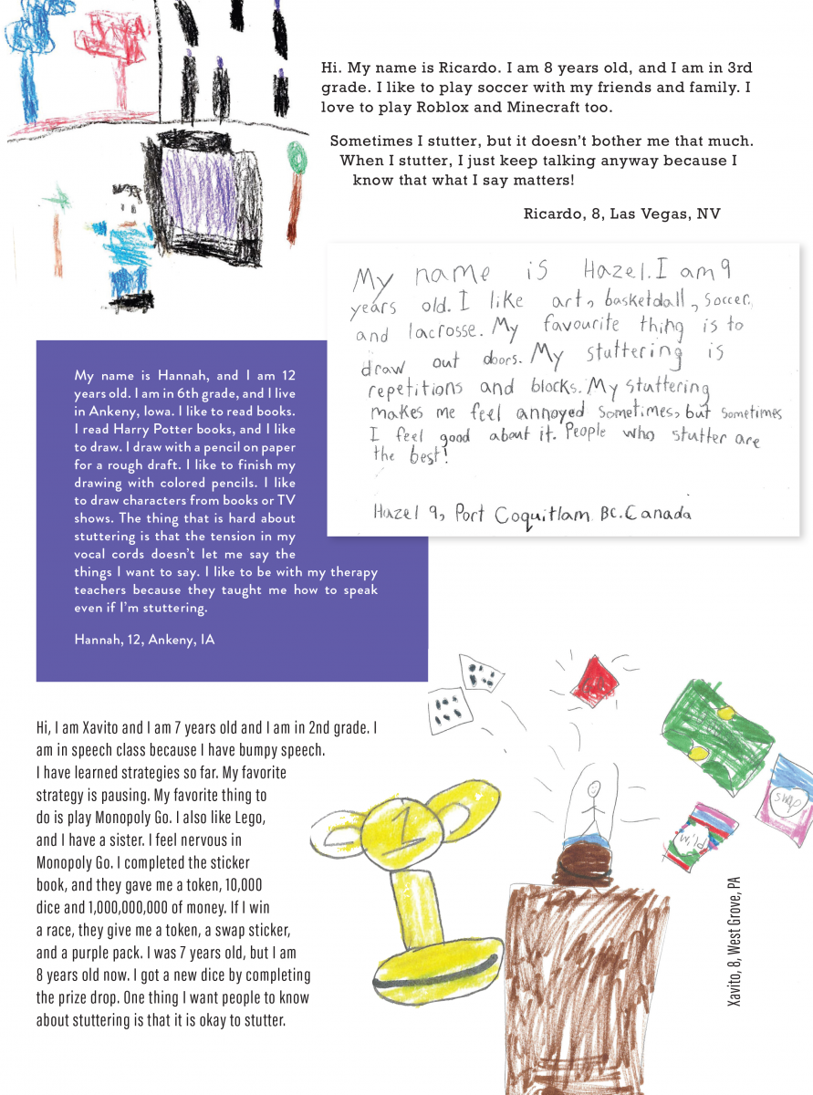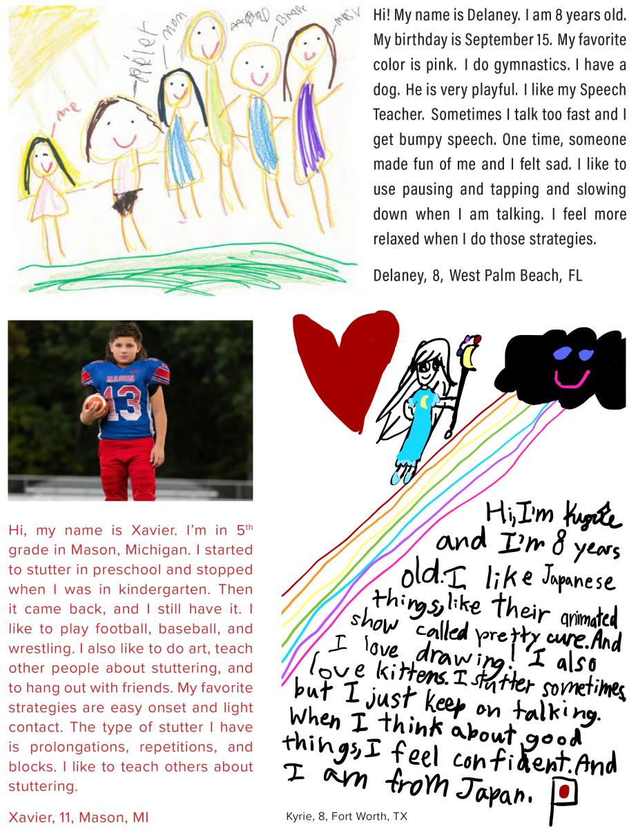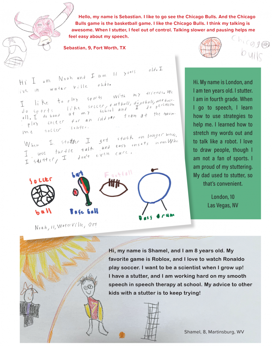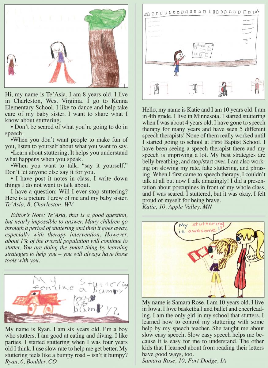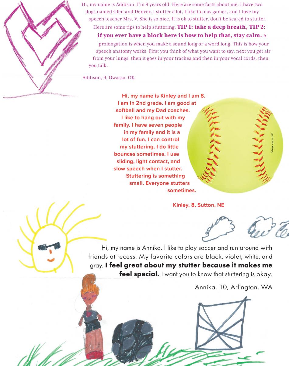 We love to get your letters and artwork to share, but we must have written permission from a parent to use them. Send your letters or pictures with signed permission to SFA, P.O. Box 11749, Memphis, TN 38111-0749 or email info@stutteringhelp.org