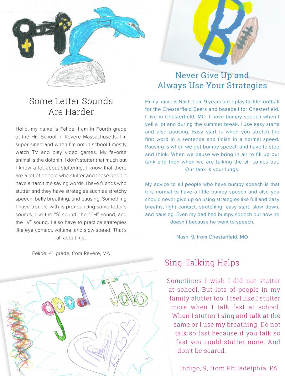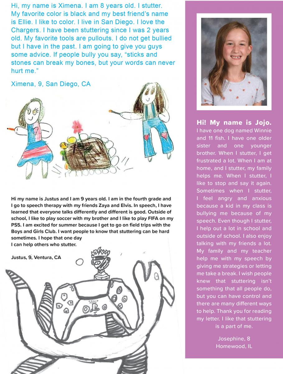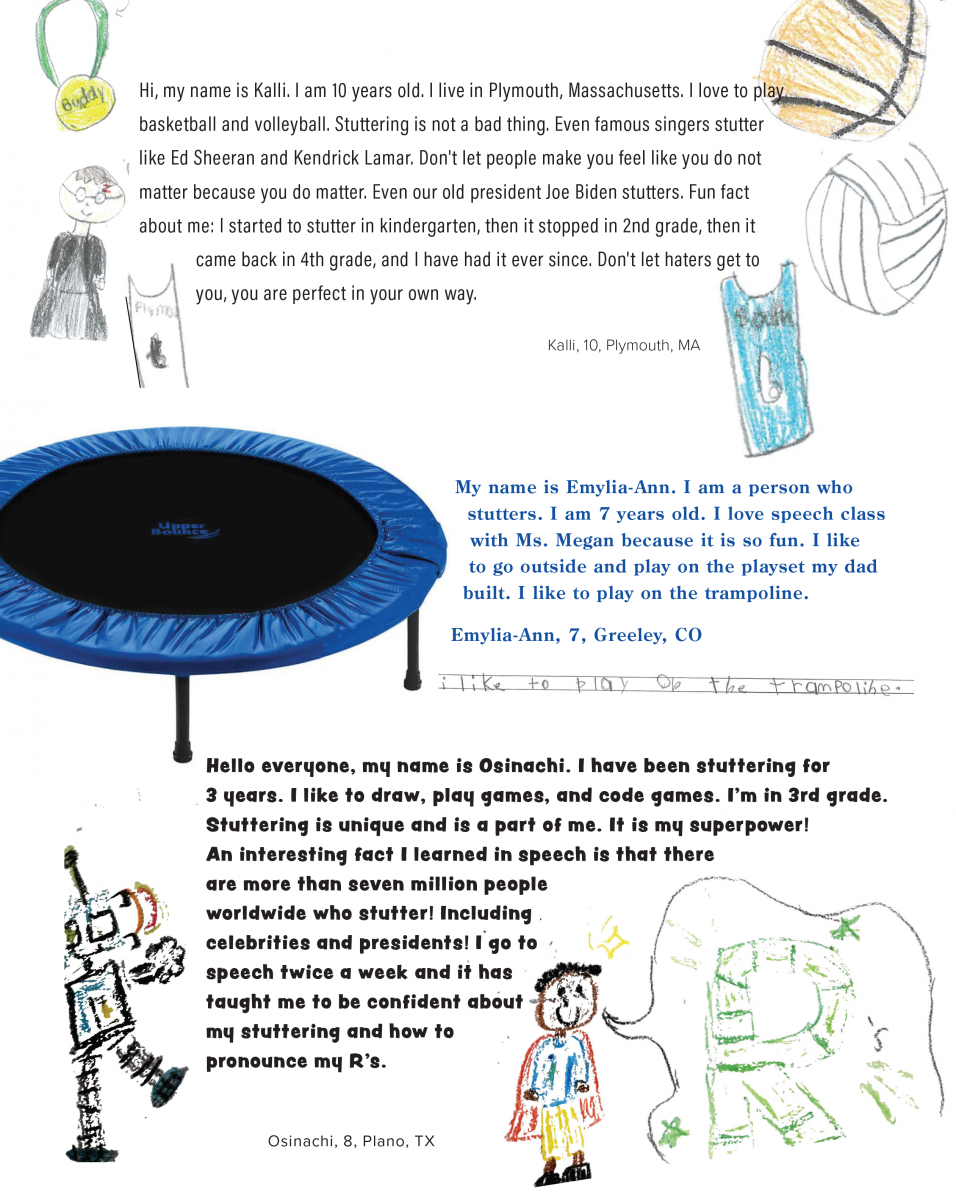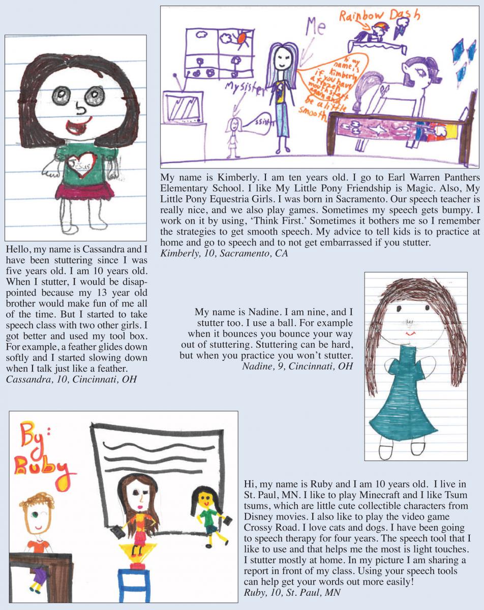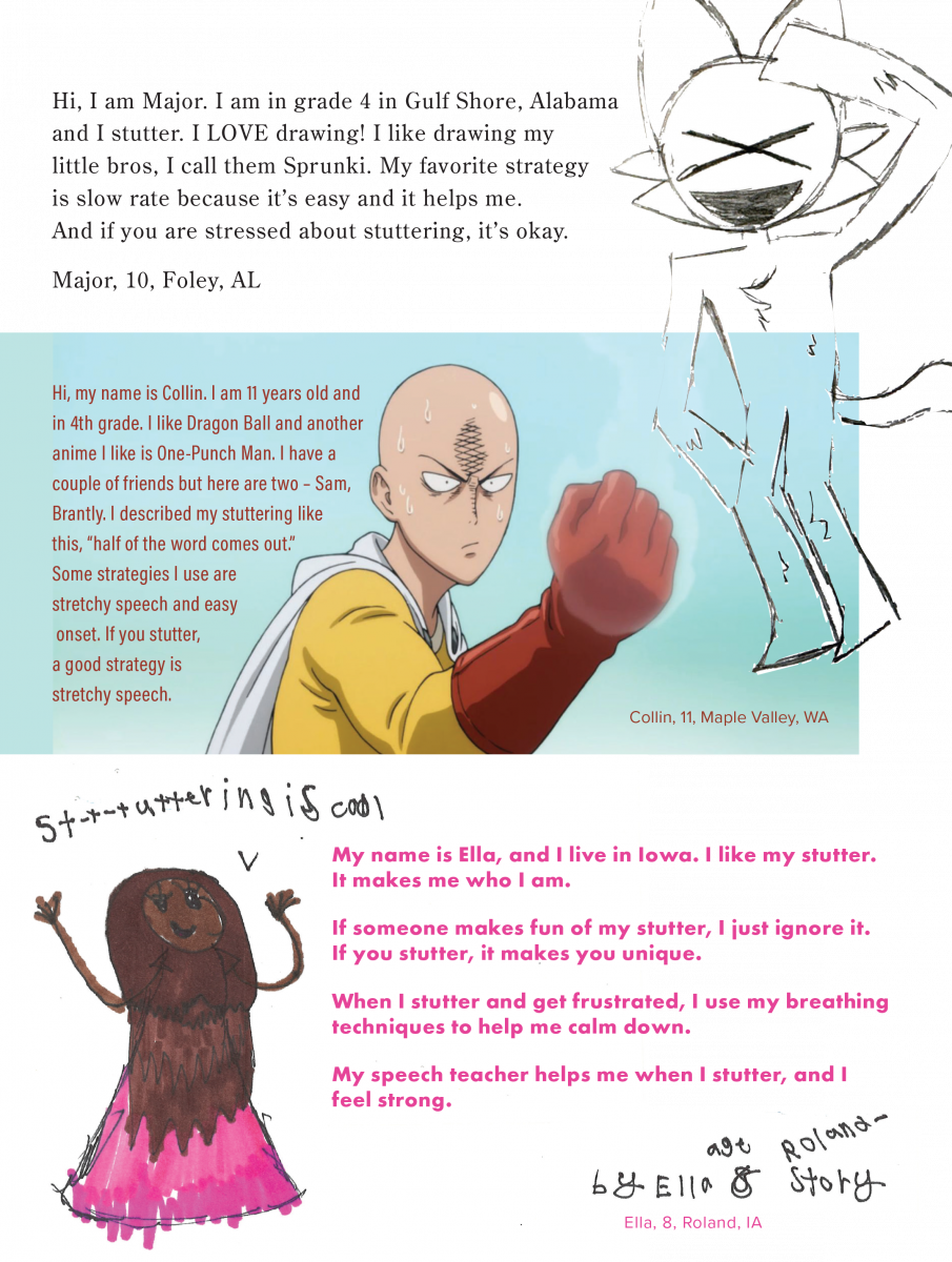 We love to get your letters and artwork to share, but we must have written permission from a parent to use them. Send your letters or pictures with signed permission to SFA, P.O. Box 11749, Memphis, TN 38111-0749 or email info@stutteringhelp.org
