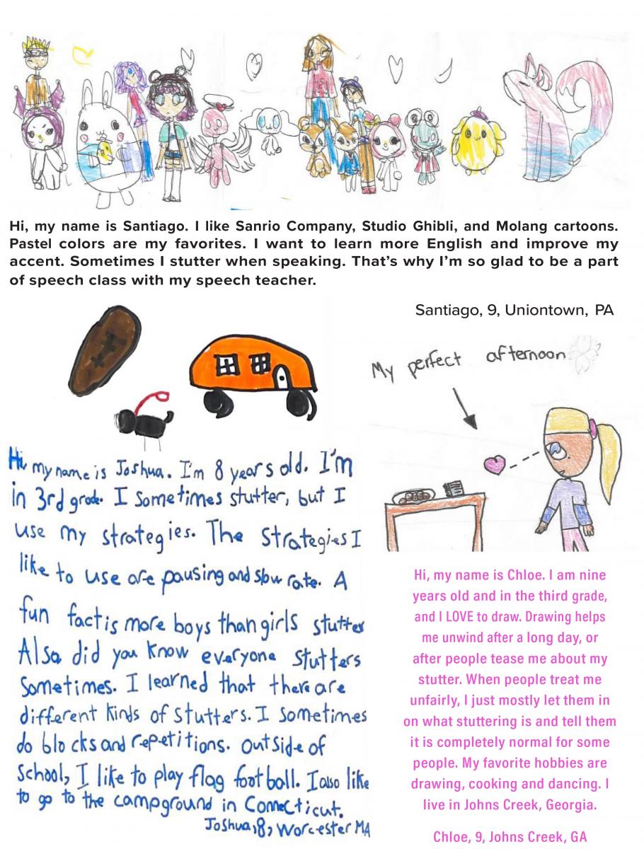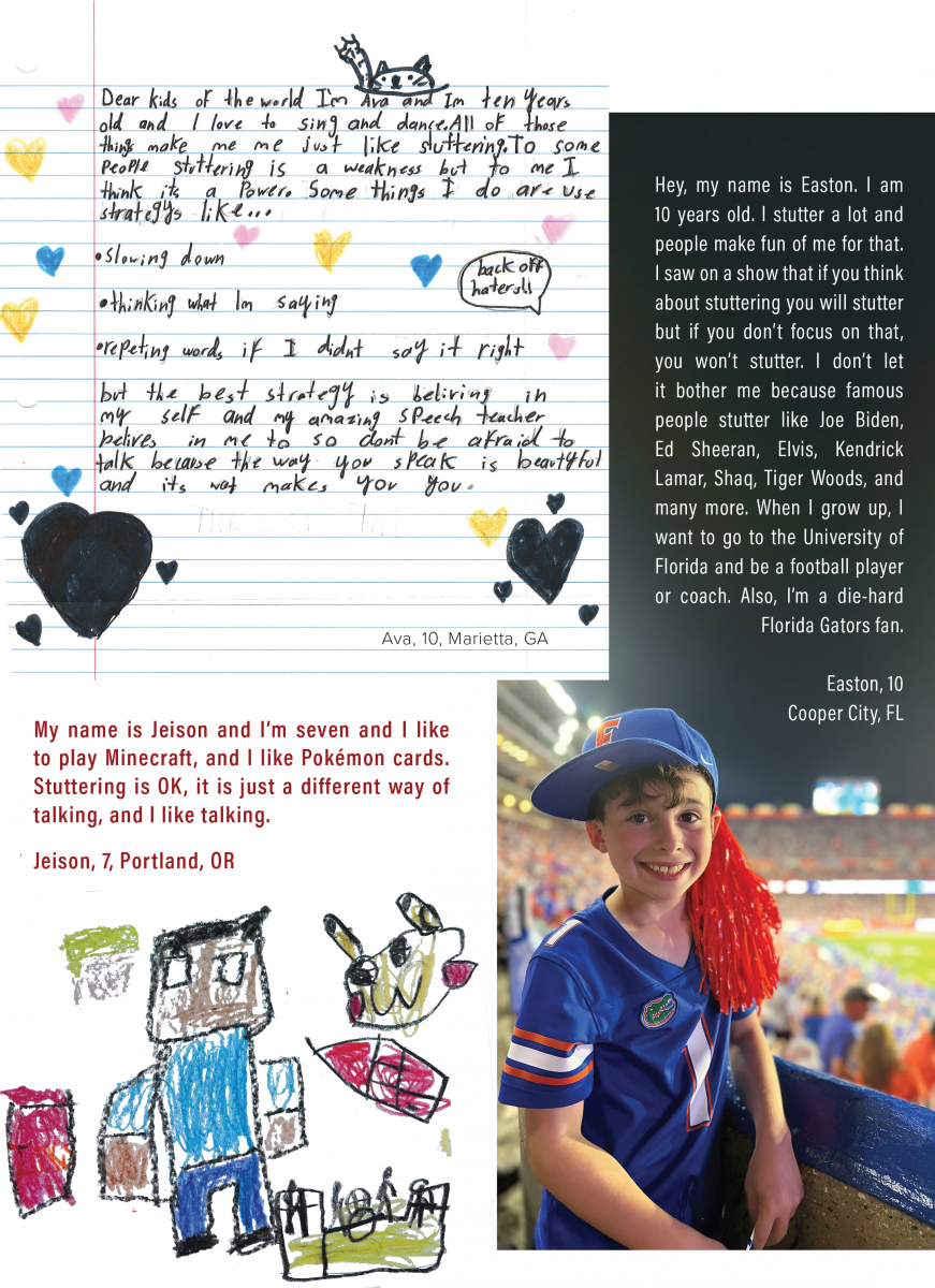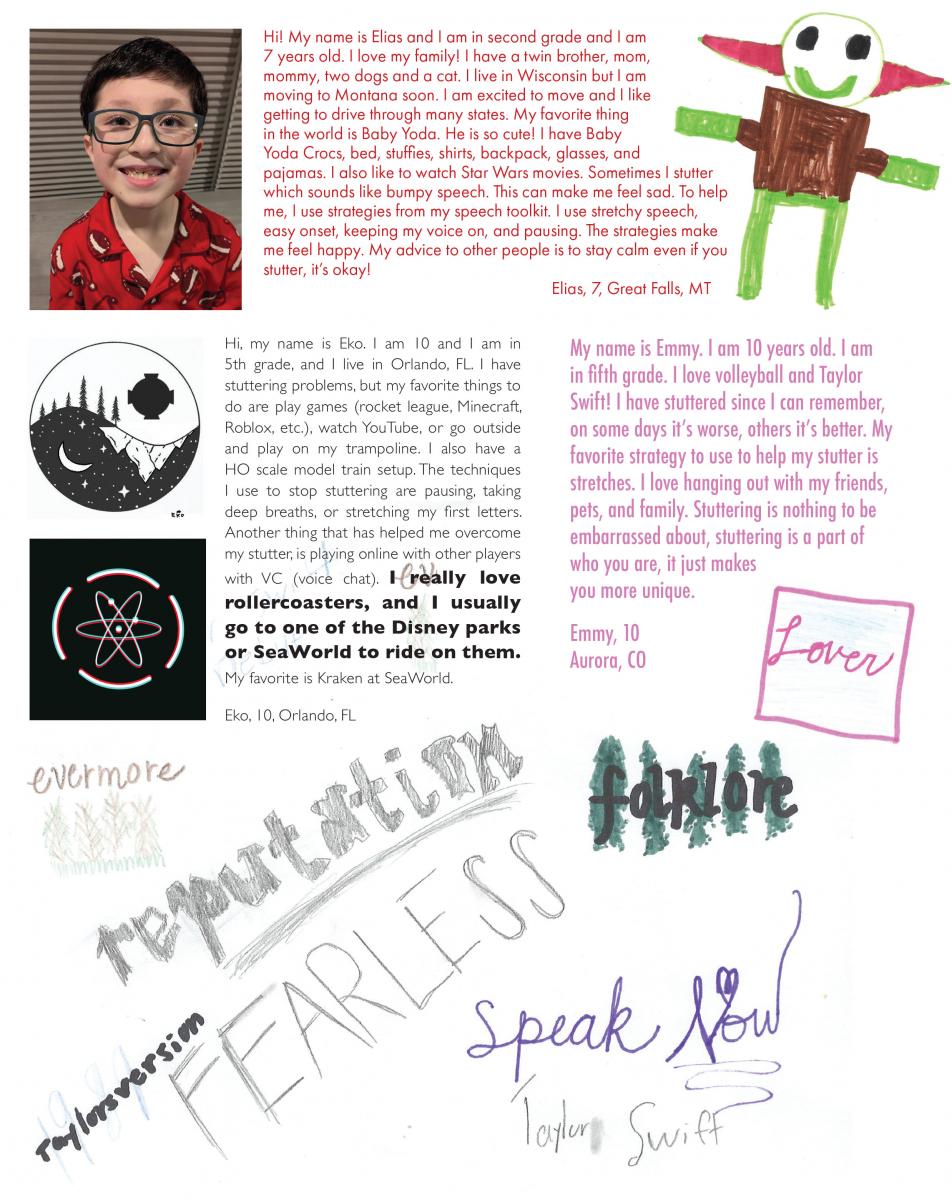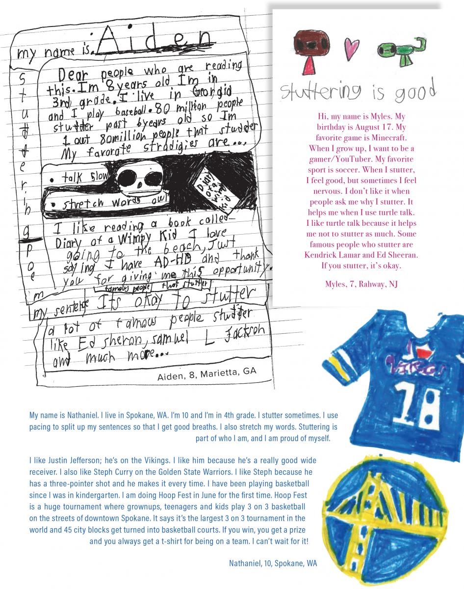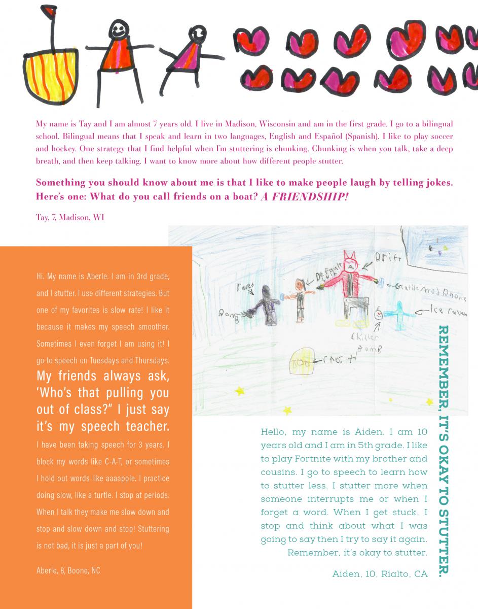 We love to get your letters and artwork to share, but we must have written permission from a parent to use them. Send your letters or pictures with signed permission to SFA, P.O. Box 11749, Memphis, TN 38111-0749 or email info@stutteringhelp.org