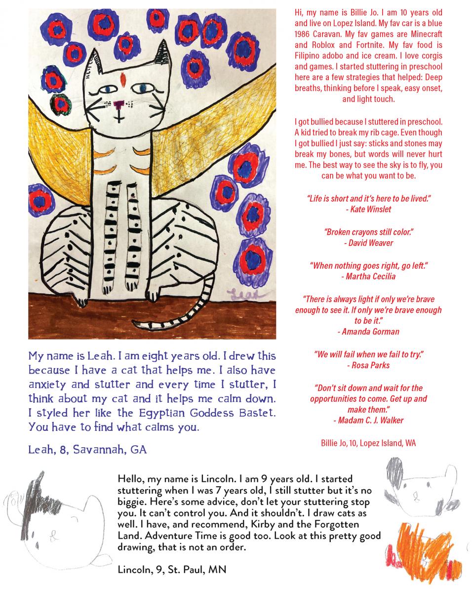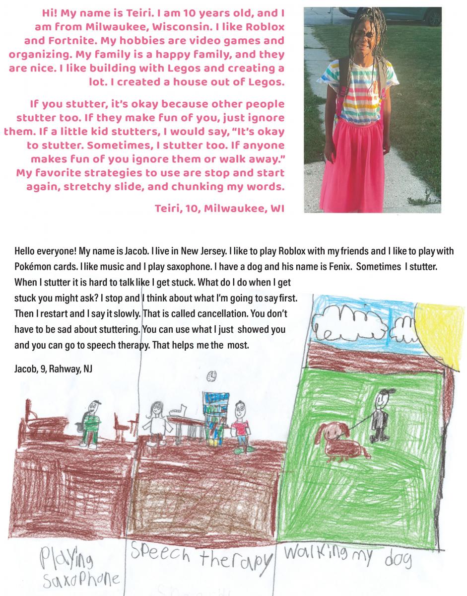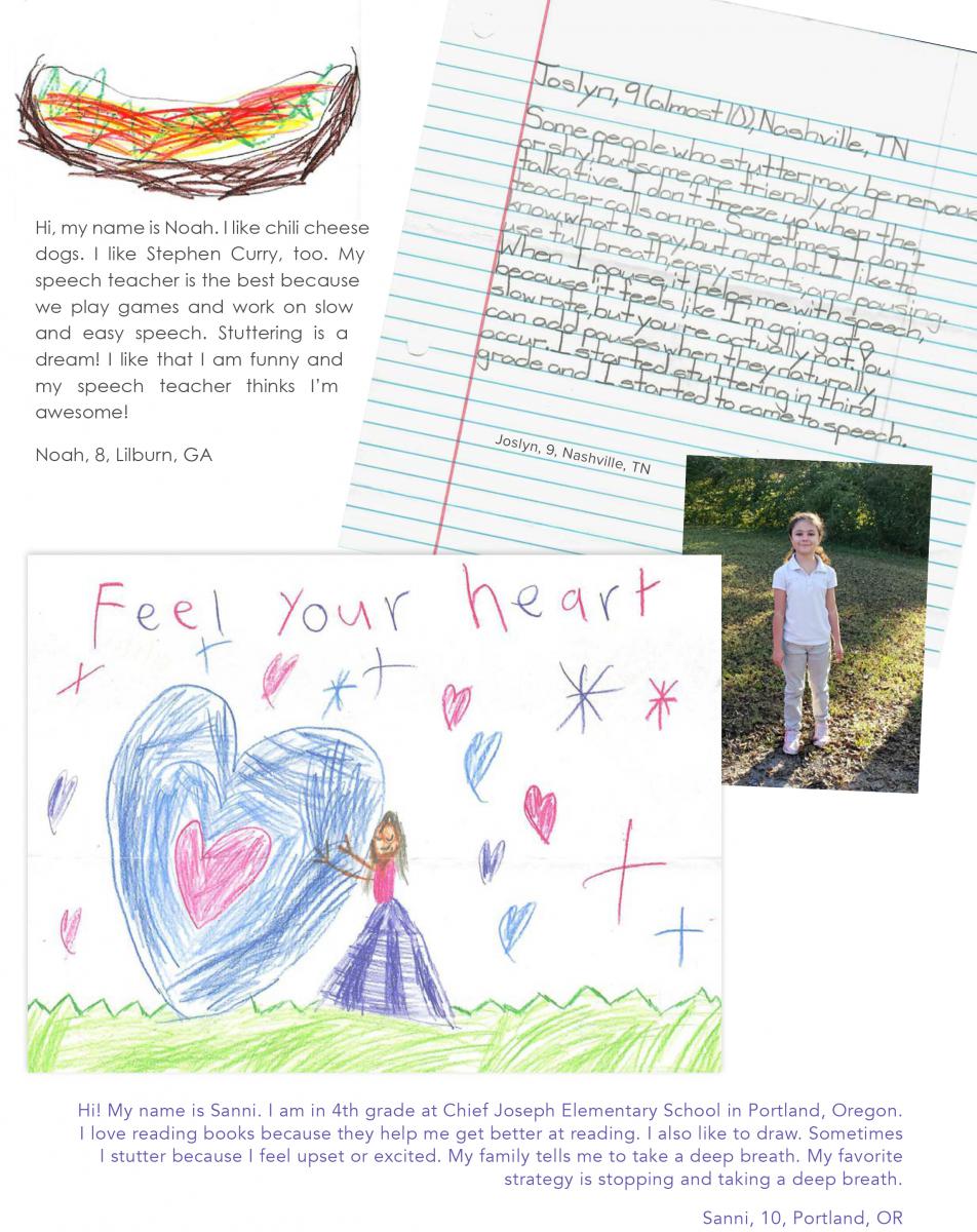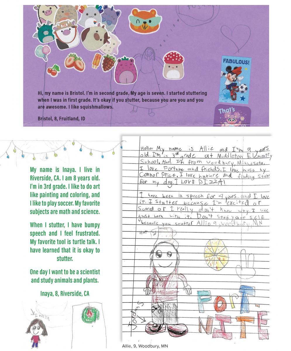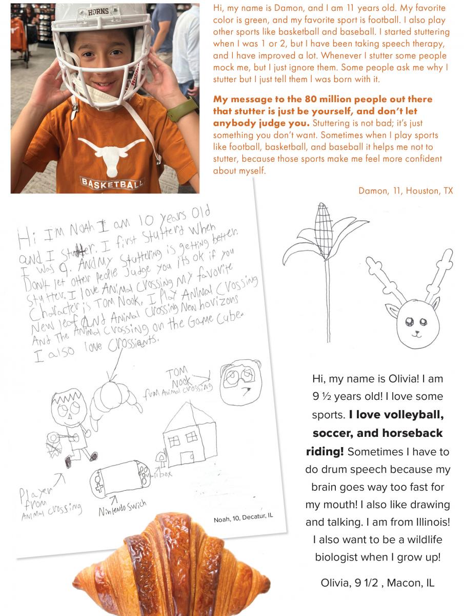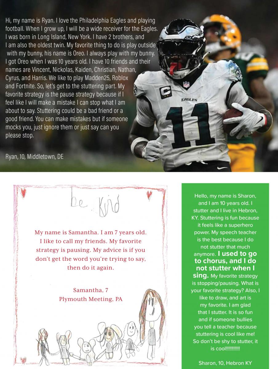 We love to get your letters and artwork to share, but we must have written permission from a parent to use them. Send your letters or pictures with signed permission to SFA, P.O. Box 11749, Memphis, TN 38111-0749 or email info@stutteringhelp.org
