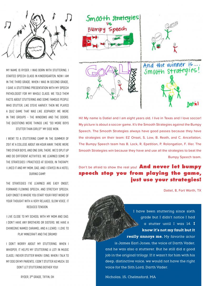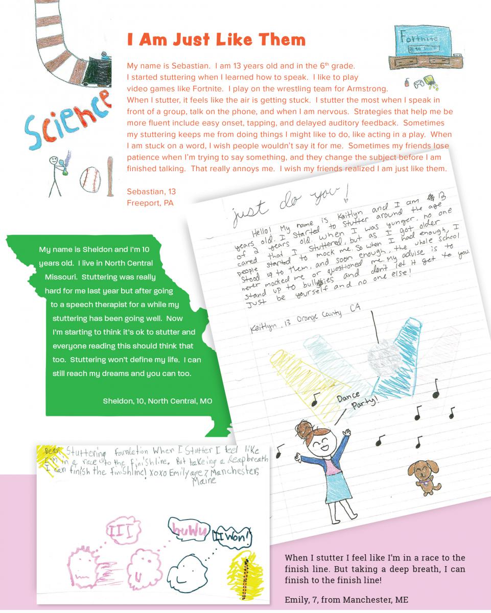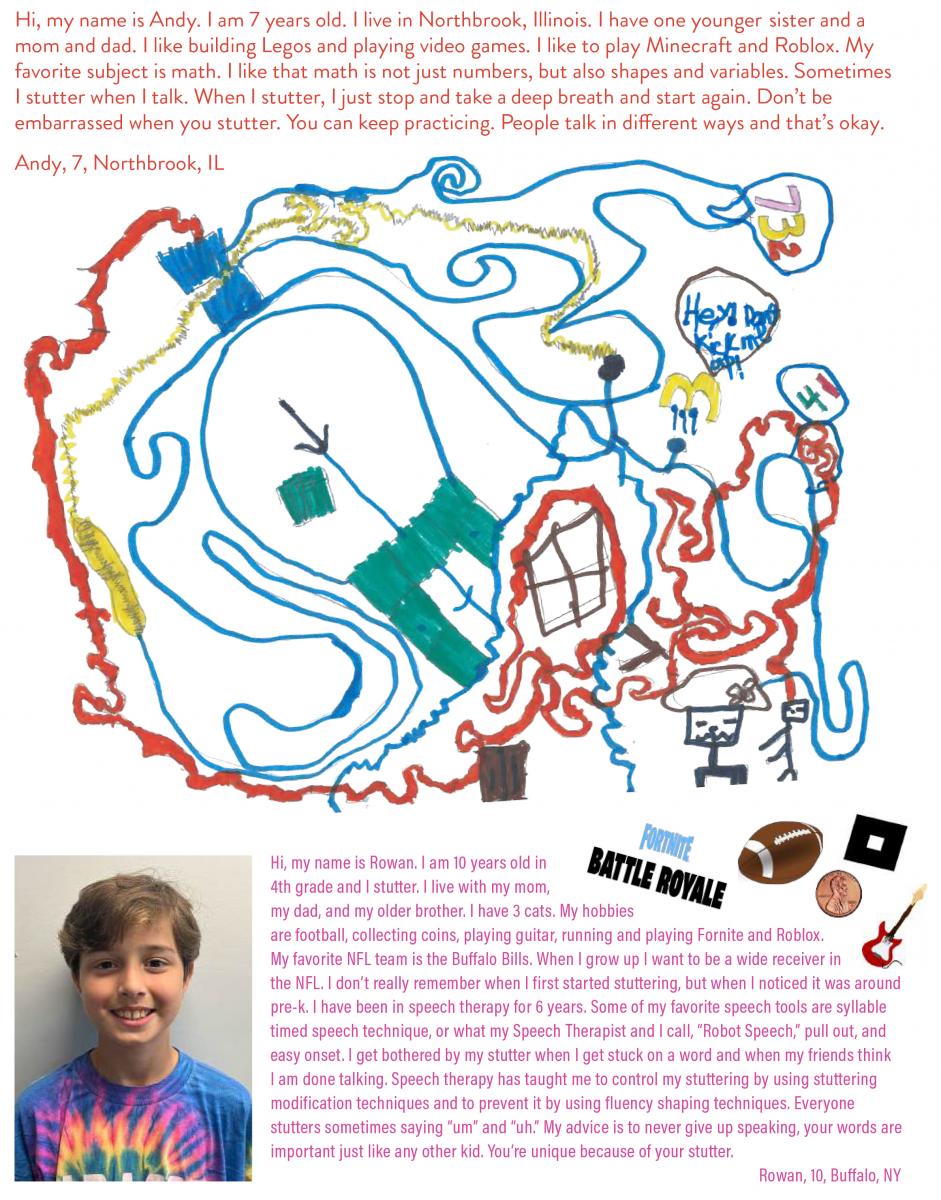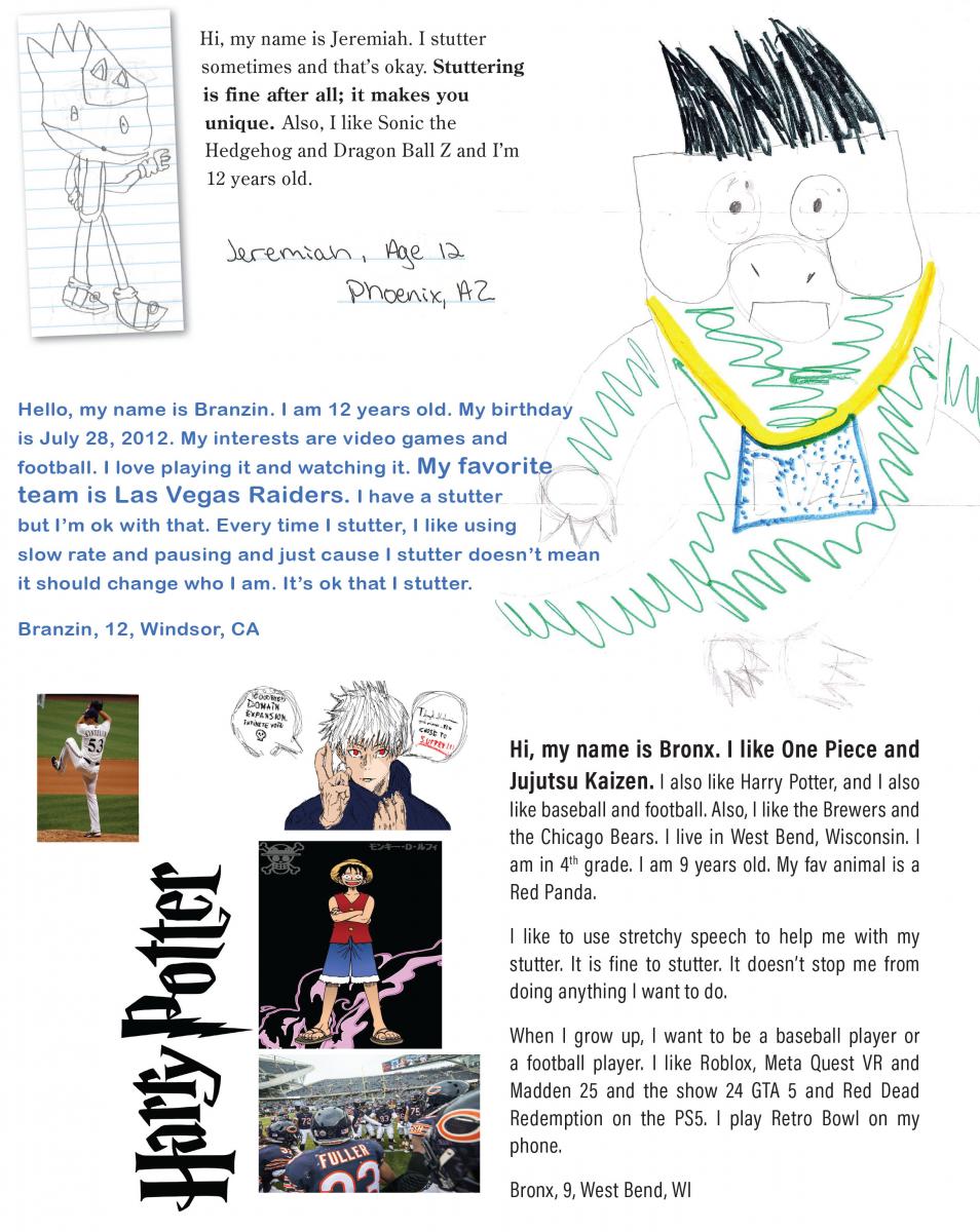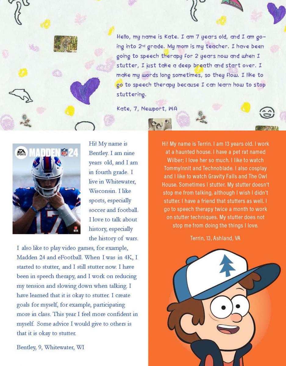 We love to get your letters and artwork to share, but we must have written permission from a parent to use them. Send your letters or pictures with signed permission to SFA, P.O. Box 11749, Memphis, TN 38111-0749 or email info@stutteringhelp.org