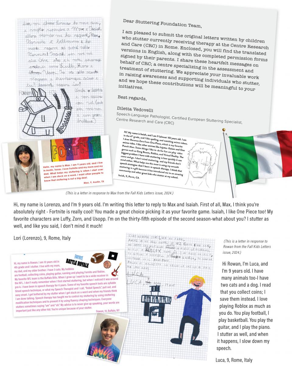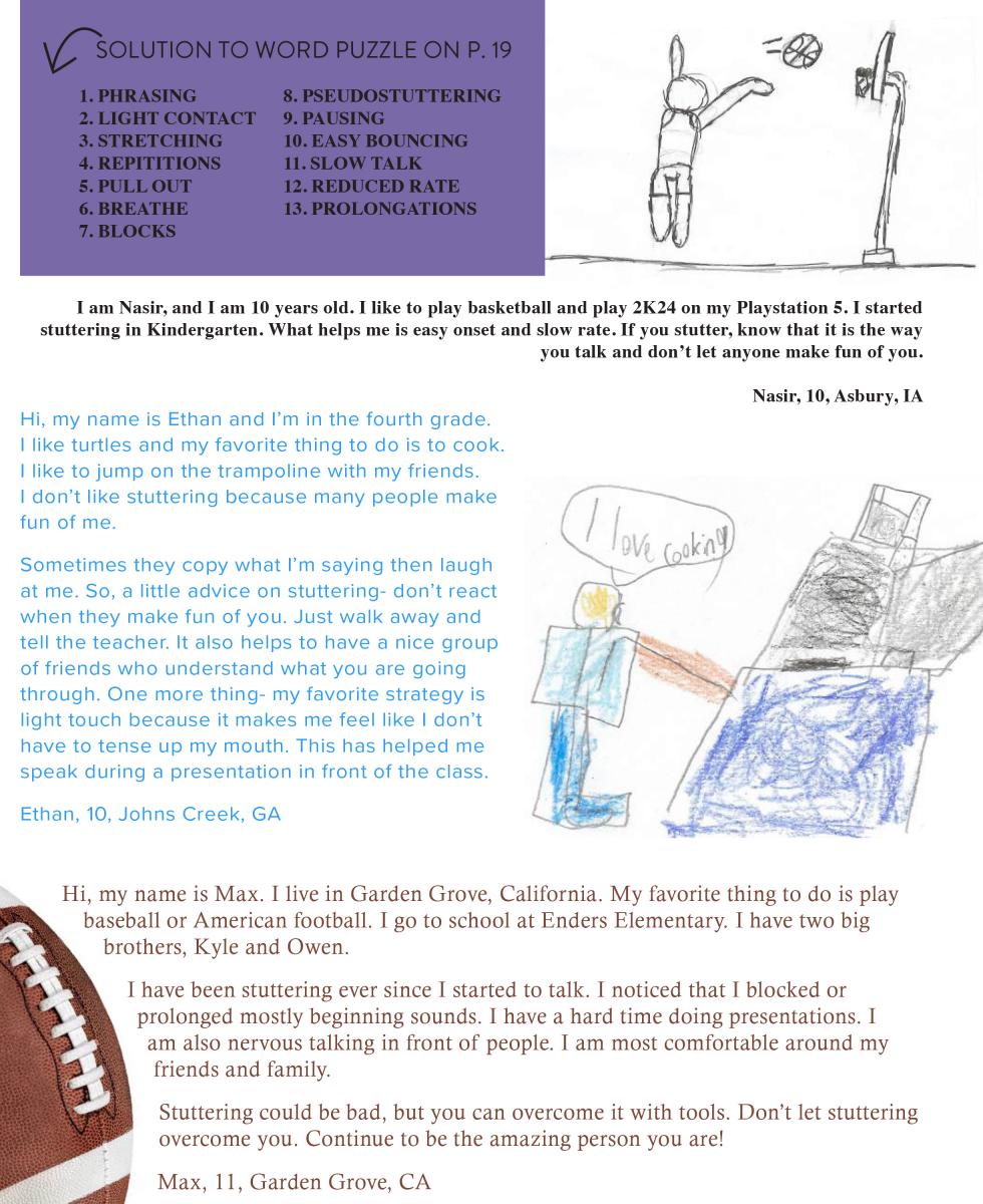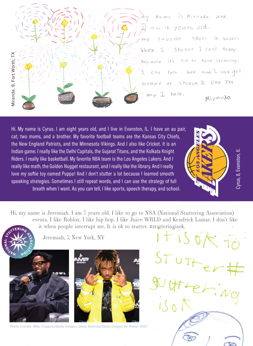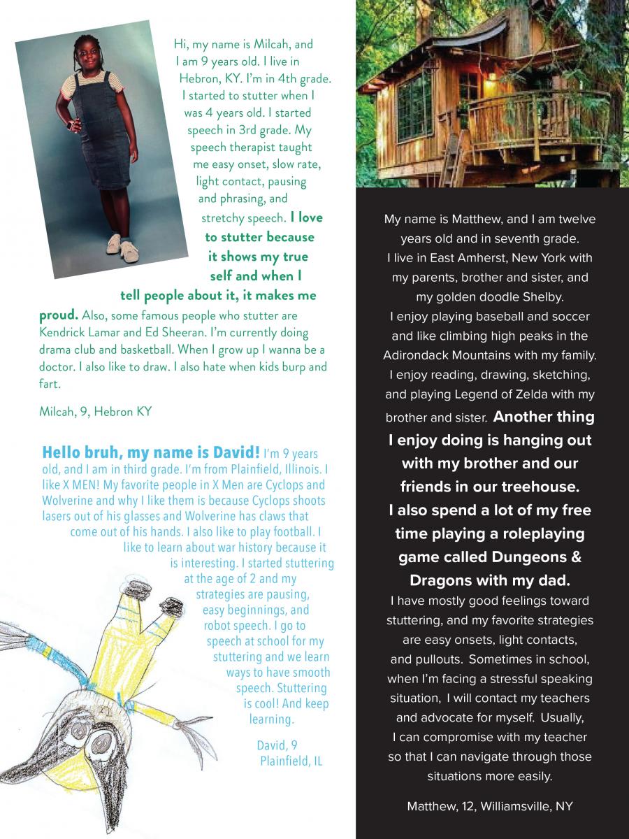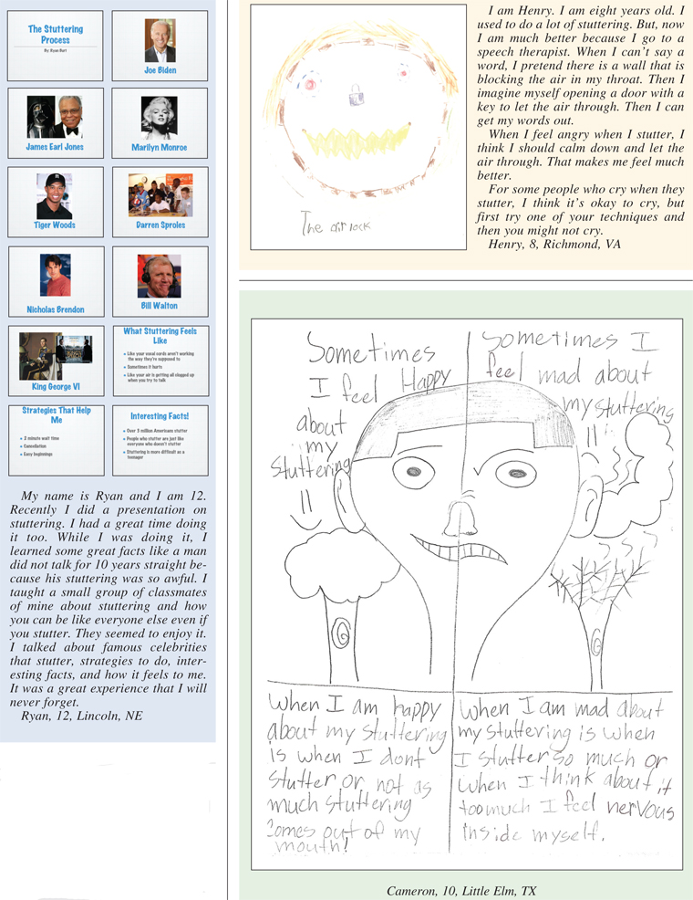 We love to get your letters and artwork to share, but we must have written permission from a parent to use them. Send your letters or pictures with signed permission to SFA, P.O. Box 11749, Memphis, TN 38111-0749 or email info@stutteringhelp.org