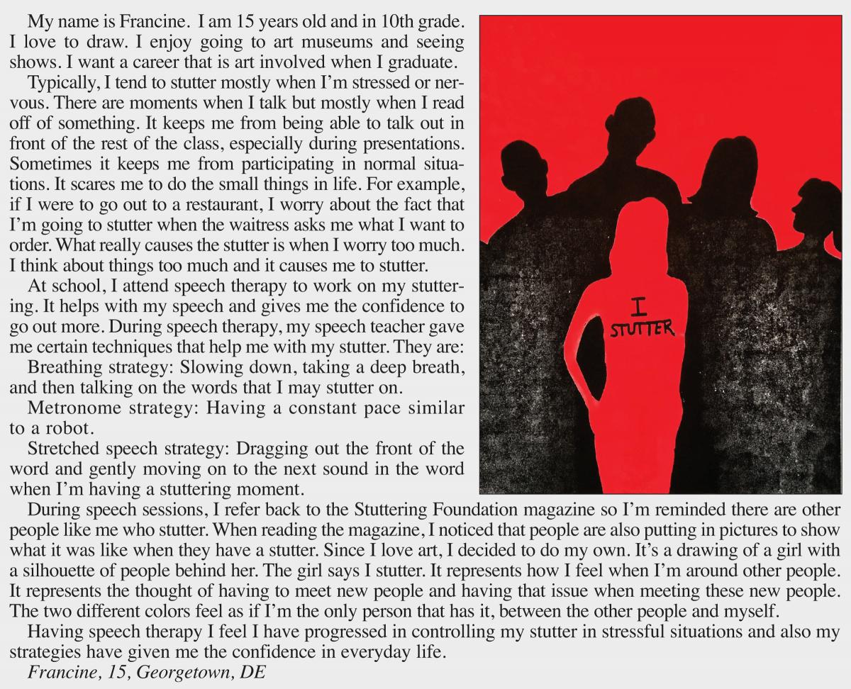 I’m sitting at my desk, I start my sentence out perfectly, not one mistake. Then I get to that one word that starts with one of those tricky letters, usually the ‘H’ or ‘W.’ I begin to repeat the syllable for what seems like at least a minute but in reality only seconds pass. I think of a metronome repeating that same Tick Tick Tick…or I say it too fast. Maybe I mess up an ‘R’ and say it like a ‘W.’ It feels like my face gets a little red and my palms moisten. I’m embarrassed but try not to show it. I think, “How do I fix this?” I start thinking and my thoughts start flowing, every once in a while a friend will complete a sentence for me, yes, I’m grateful but sometimes it gets in my way. When I am talking, there are times when I will realize there is going to be a tough word and I will want to change the word because I know I’m gonna get stuck, but that would just make my sentence irrelevant. But that was then; I’m getting better now. I’ve learned it fluctuates with mood. I think it’s sort of funny that if I’m mad and begin arguing, my words come out perfectly. The things I shouldn’t say are the easiest when I’m upset. When I’m excited it could be the hardest to get my words out, unless I yell. When I am with friends, I feel comfortable but even when I feel safe, there I go again. I try to maintain a mellow pace but it often ends up the same way. I always have those days when it’s exceptionally difficult but for some odd reason the teasing seems to help in some way. It makes me happy that close friends can joke about things like that. But I’ve walked the fine line between teasing and mocking, hoping I don’t end up on the wrong side. Altogether this has made me the person I am today, without the teasing or the support, I wouldn’t be as confident. I like to think of it as a blessing, and try to find the silver lining. I know if I let every word get to me, I’d regret every word I said. Maybe I can help others who struggle with this too. Those who stutter and maybe don’t have it as good as I do might be encouraged by my experiences and my take on things. Nevertheless, I strive to keep making improvements in my fluency and articulation while keeping my head out of the clouds. High school will be a whole new experience and thanks to the progress I have made this far I am confident I will succeed.Gage, 14, Lockwood, CA