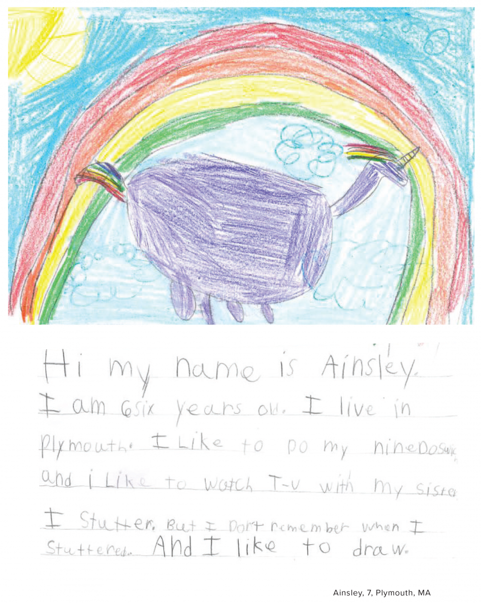 Hi, my name is Dylan and I’m in 3rd grade. I started stuttering when I was 3 years old. It stopped for a while as I grew, but came back when I was 5 years old. I stutter in many ways, like holding onto sounds and repeating parts or whole words. I go to speech inside and outside of school. My fluency has improved over the years. I am 8 years old now and doing very good. I think it is sort of funny that I stutter least when I am unaware of my fluency. I am glad I’m not the only one stuttering.Dylan, 8, New Bedford, MA