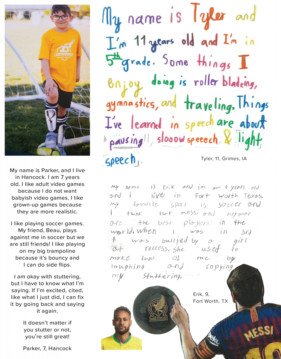 My name is Gabriel and I am 10 years old. I do speech therapy at Olive Crest Academy in Orange, California. I am a very cool kid and I like coming to school, sometimes. My favorite things are playing with my friend Manny, riding my bike, and playing soccer. I keep saying that I do not ever ever ever stutter but my speech therapist tells me that I do. When my words get stuck and won’t come out the way I want, I feel very mad. I feel like an idiot. I feel angry and dumb. We have been reading stories about your foundation and about kids who stutter. I am not sure if I like listening to the stories or not. My therapist suggested I write you a letter but I was not sure if I really wanted to. The strategies I remember are waiting 2 seconds, pausing for 1 second in the middle of my sentence, and cancellation, where I stop, pause, reverse and start over. This is all I really have to say. Are you going to write back to me? I sure hope so, because I want to know how you feel about my letter.Gabriel R., 10, Orange, CA