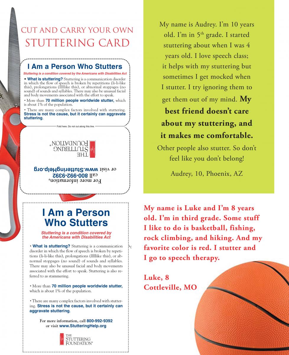 Hi, my name is Aidan and I am 9. Stuttering is okay. If you think about it too often you will be sad. I don’t think about stuttering because I know if I do, I will stutter. You shouldn’t think about it either. Speech therapy helps me. I use pull outs and cancellations. When you get bullied you should stand up for yourself and not let it hurt you.