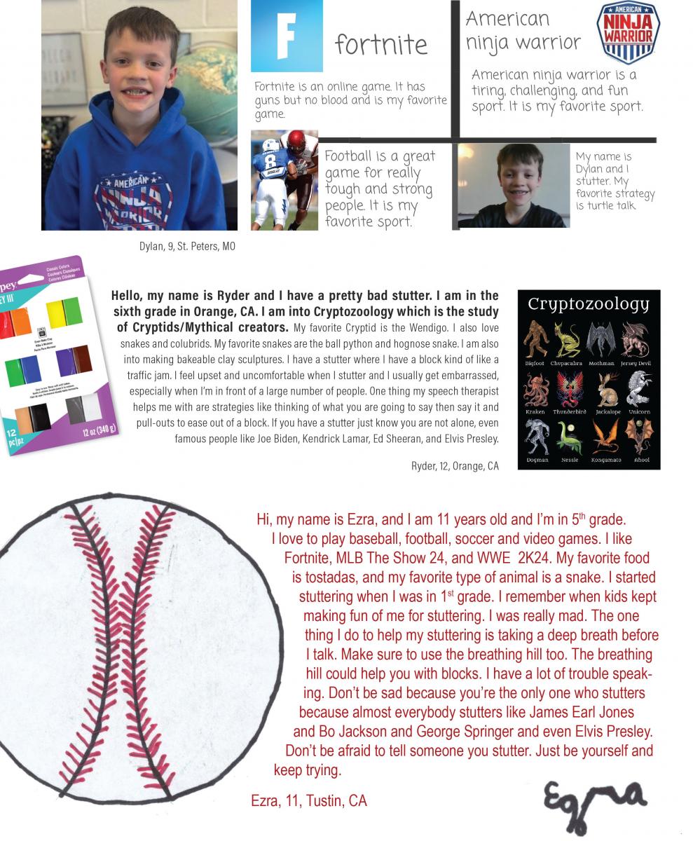Hi! My name is Ryan. I am 11 years old. I live in Glenview, Illinois. I am in 5th grade. I go to Pleasant Ridge School. I started stuttering when I was 5 years old. I go to speech two times a week. My favorite sport is baseball. I decided to write to this magazine because of the connections of the other kids while reading the stories. Strategies that help me in speech are thinking pauses and pre-reading before I have to read aloud to my speech teacher. For kids who stutter I want them to know to keep trying really hard in speech.