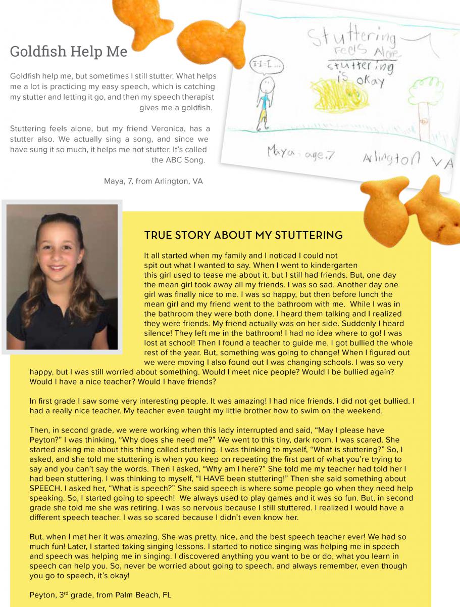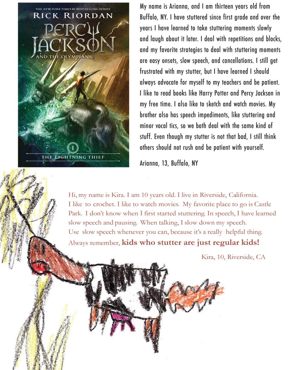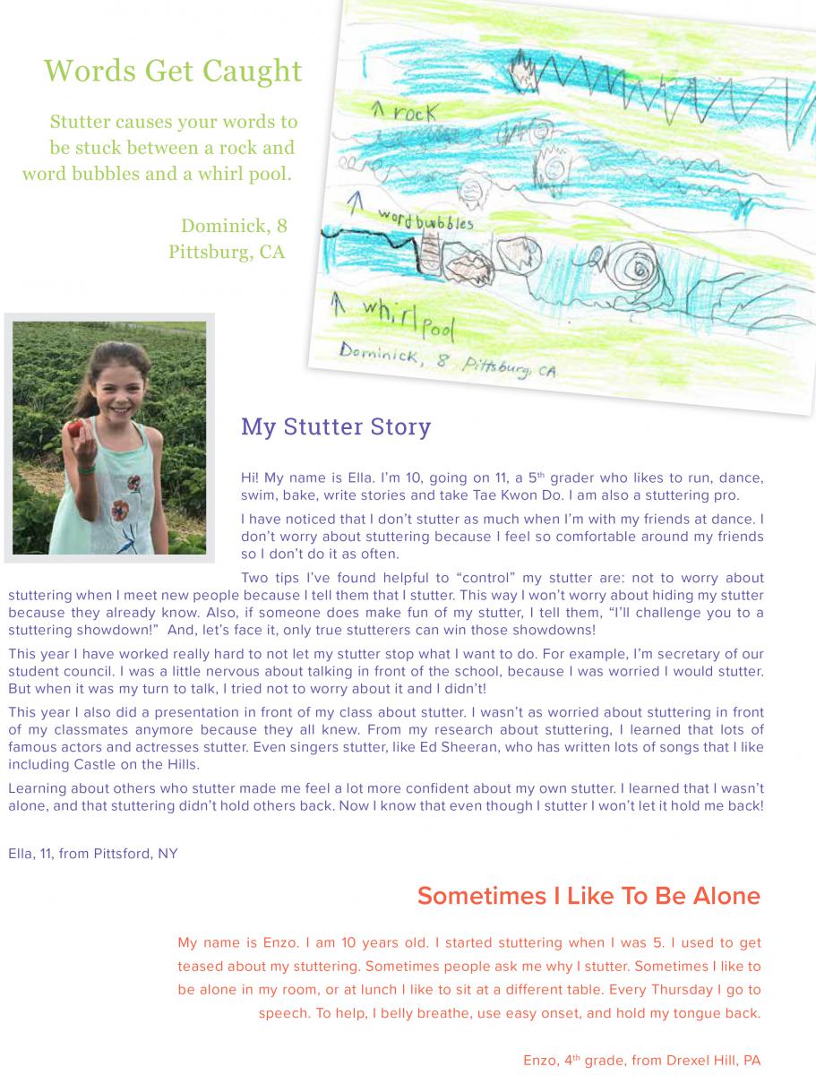 I think that kids who stutter should not feel sad about it. I have been going to therapy for 2 years, and she has [taught] me how to overcome stuttering. I am 10 years old and I have been stuttering all my life and I don’t stutter a lot now. Kids shouldn’t be upset about stuttering. I feel special about it, and other kids should too.
