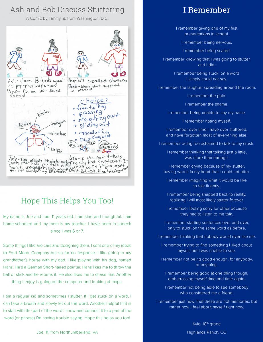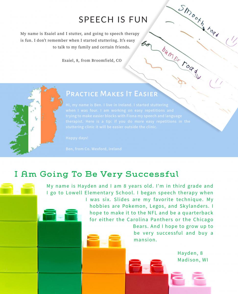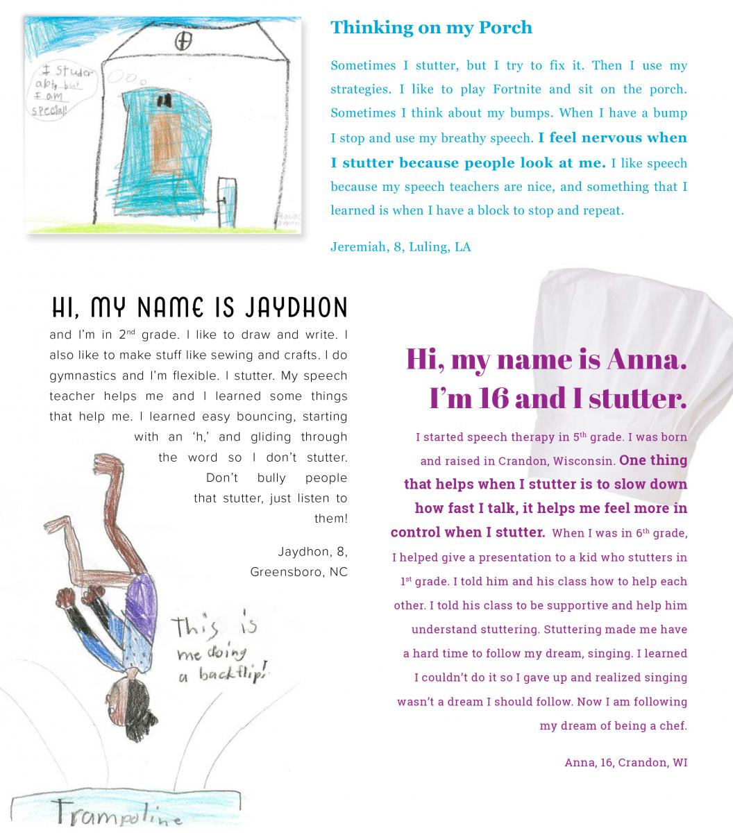 Hi! My name is Jonah. I am 8 years old and I am in 3rd grade. I was born with my stutter. When I was in Kindergarten people used to make fun of me. When I moved to Ritter Elementary School, everything got better. I have a lot of friends. Sometimes I know when I am going to stutter, so I stop and think before I stutter. My teacher Ms. D. helps me to stop stuttering.Jonah, 8, Newport, MI