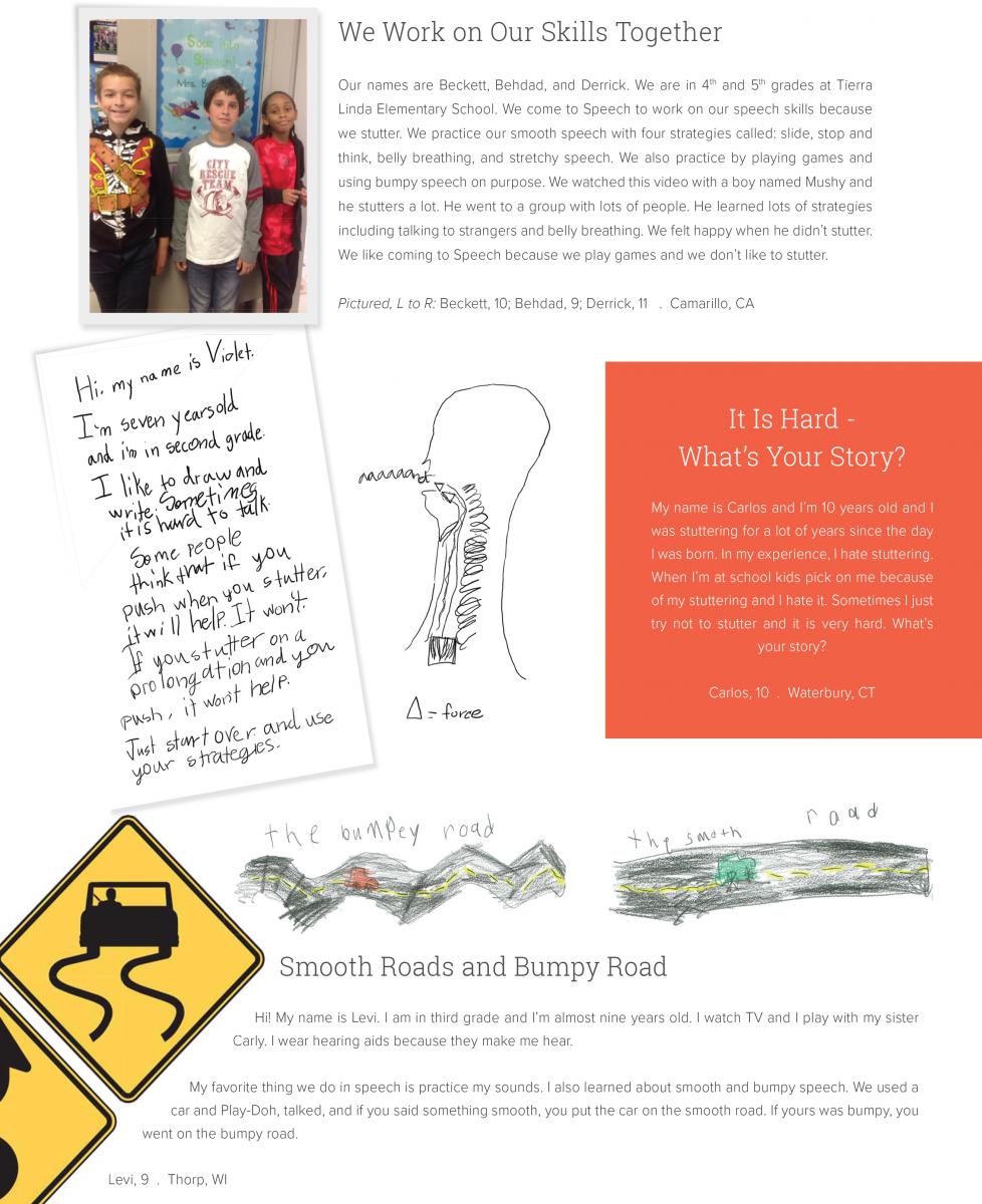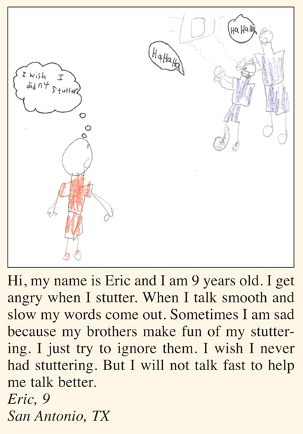 stuttering, I go outside and go to my friend’s house. He makes me feel good. He stutters like me and we are best friends. He keeps saying that I should try to quit and some people say, “Why do you say words over and over?” I say I stutter a lot. I go and sleep to help me stop stuttering. Some people call me “stutter-mouth” or call me “stupid.” I like the way I am! I have a favorite teacher who helps me with my speech. Here is a helpful hint: Try to have a friend just like you!