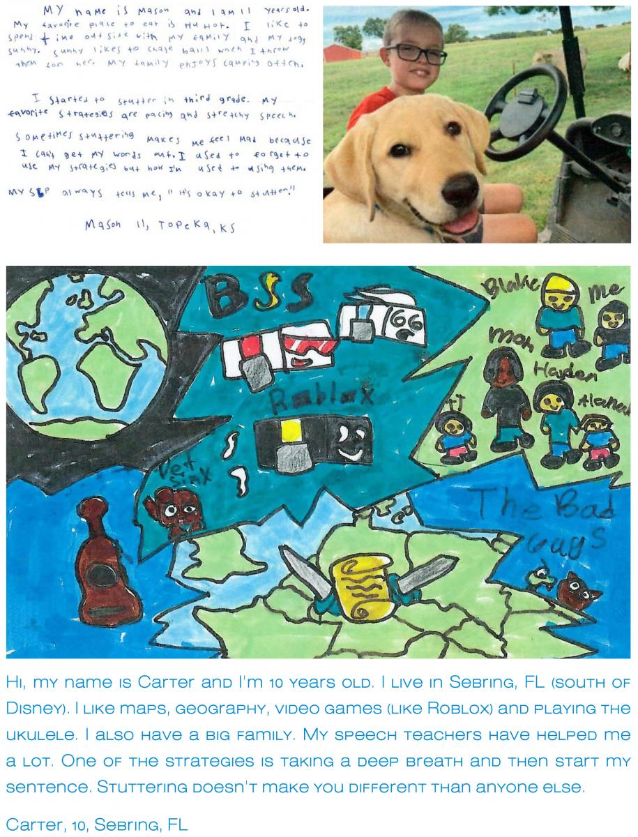 Gage, 10, writes, “My stutter is a car driving on a bumpy road.”